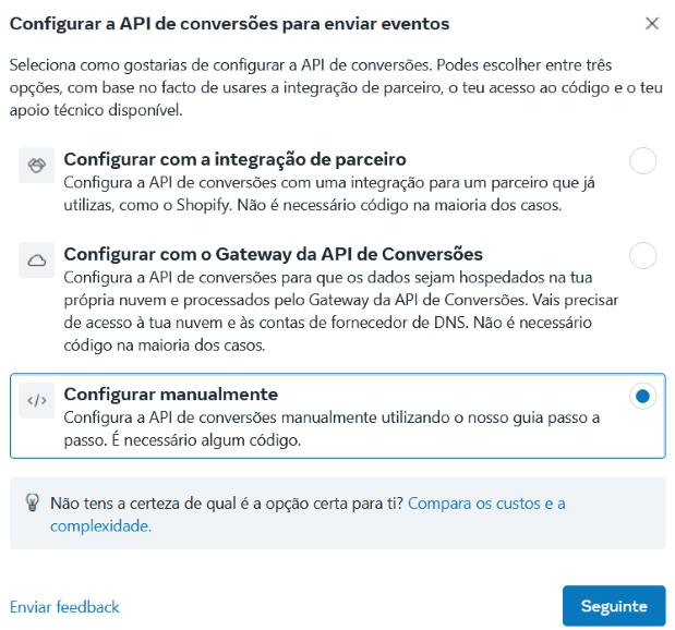 Elige «Conectar manualmente» y «Solamente Meta Pixel».